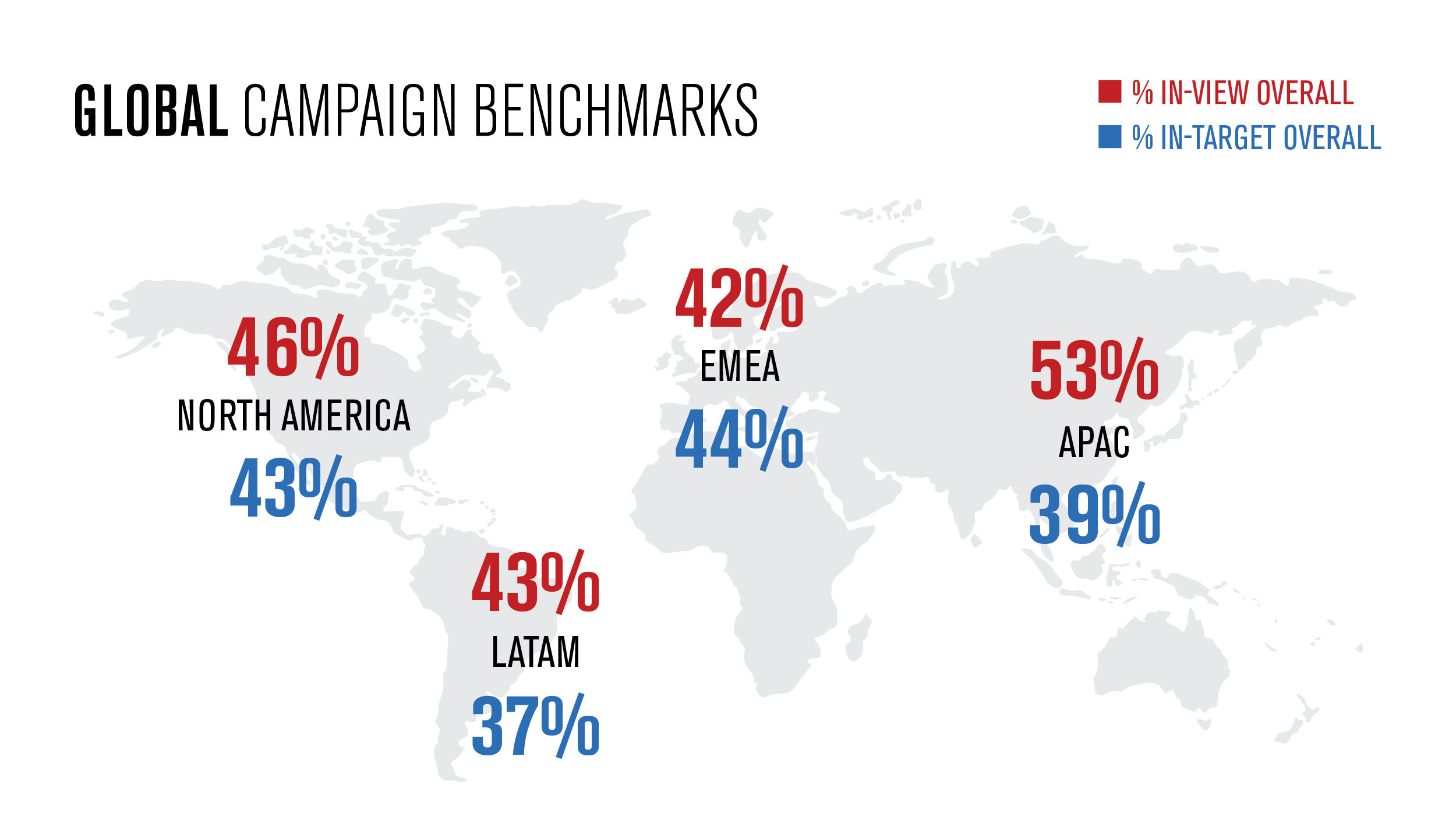 Globale ZielgruppenerreichungDie Daten zur Zielgruppenerreichung liefern kein besseres Bild. Differenziert nach den Regionen Nordamerika, Lateinamerika, EMEA und Asien-Pazifik haben lediglich 37% bis 44% aller Display Ads die gewünschte Zielgruppe erreicht.