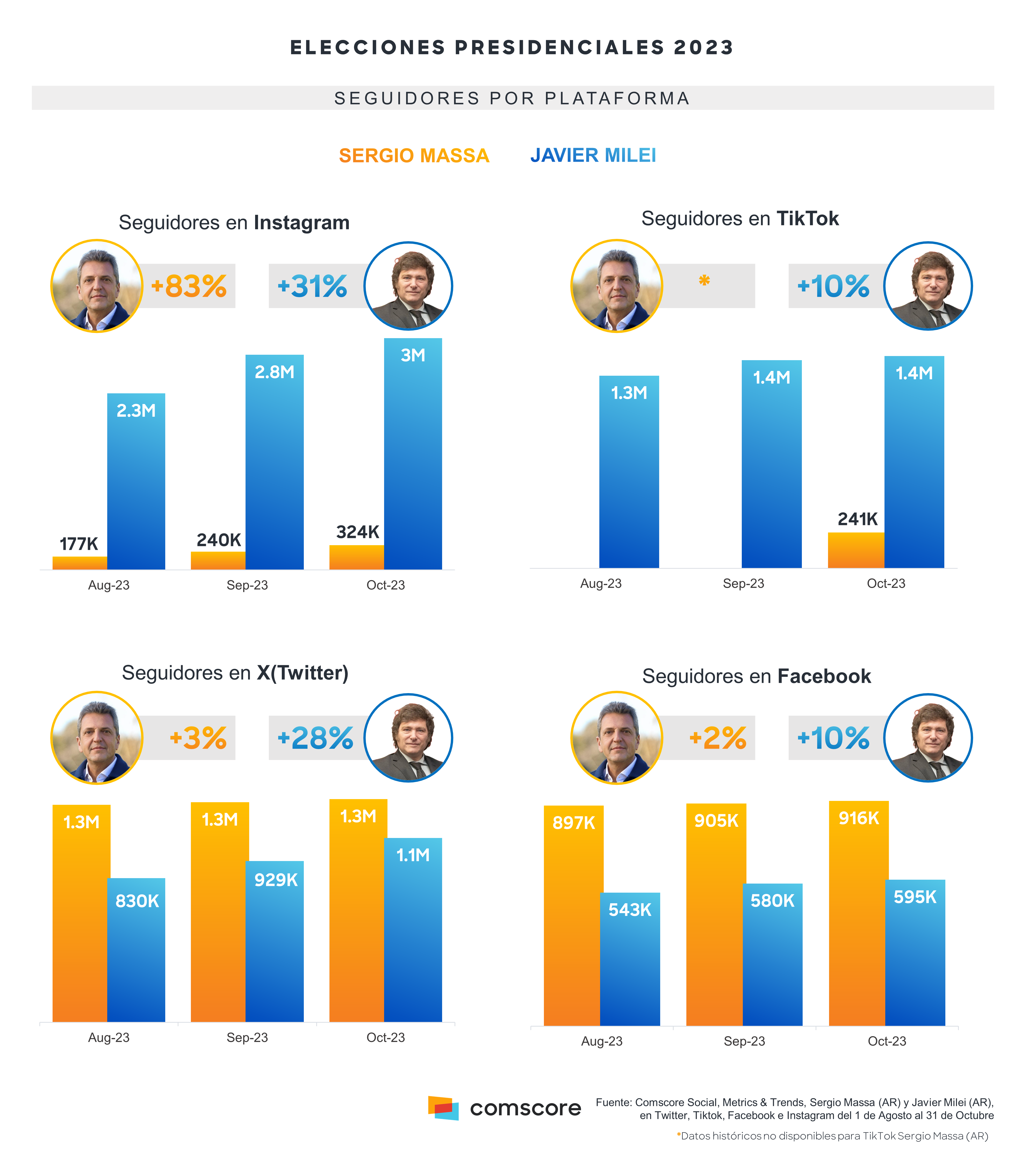 Ambos candidatos han sabido utilizar eficazmente sus cuentas en redes sociales para transmitir sus propuestas e ideales, principalmente a través de las plataformas de Instagram y TikTok. En los últimos tres meses, han experimentado un notorio crecimiento en su base de seguidores sociales, con incrementos de más de dos dígitos. Destacando el caso de Sergio Massa, que ha experimentado un impresionante crecimiento del 83% en su número de seguidores en Instagram y registrando 324 mil seguidores en el mes de octubre 2023. Además de contar con 1.3 millones de seguidores en X (Twitter) y 916 mil fans en Facebook.