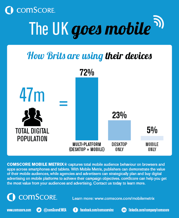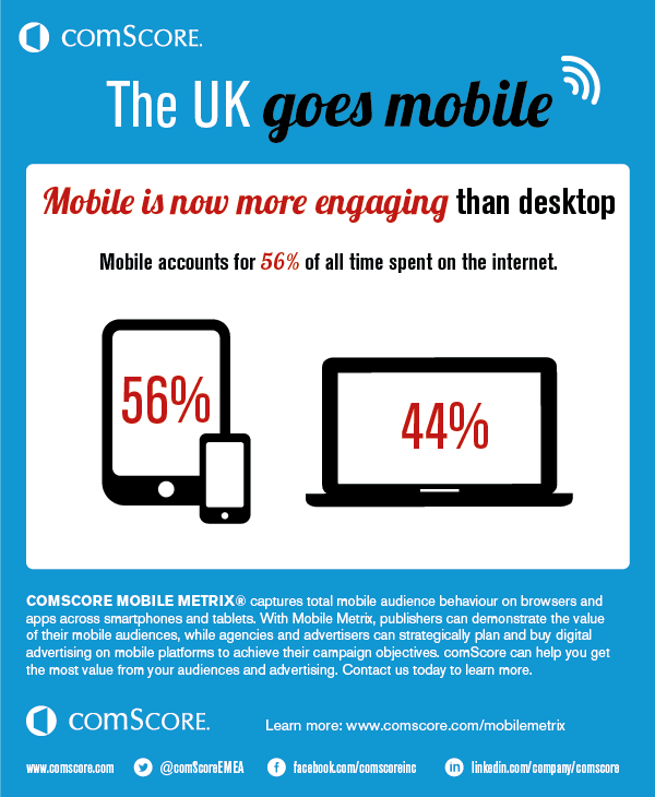 The introduction of mobile devices has completely changed the digital landscape, more than we could have predicted a few years back. Over 72% of the 47 million large UK digital audience access the internet via more than one device, be it a combination of desktop/smartphone or desktop/tablet. Mobile has also now become more engaging than desktop, accounting for 56% of all time spent on the internet.