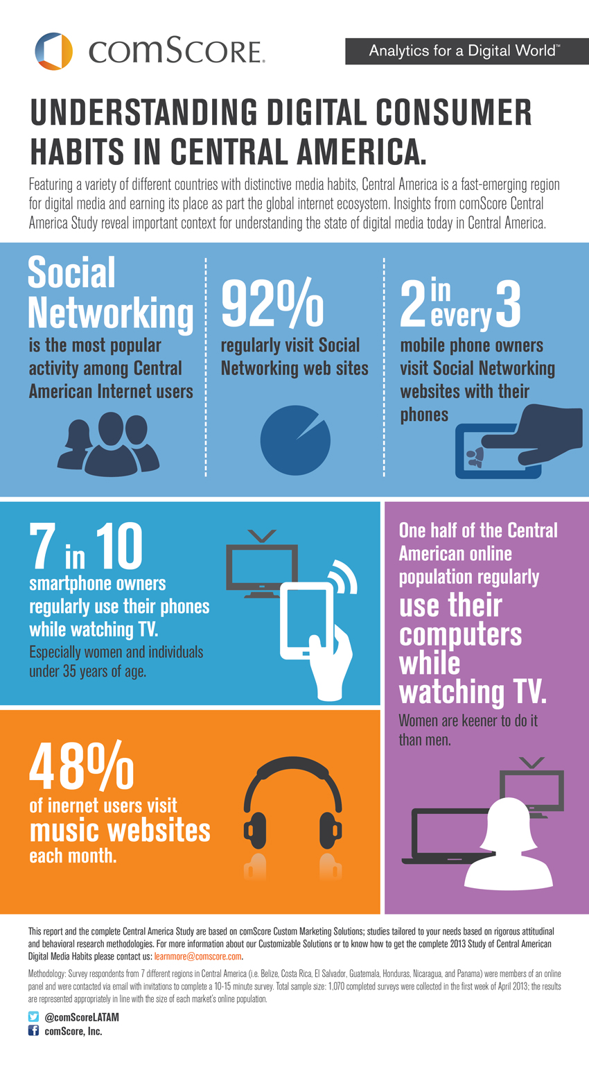 Comscore recently released the 2013 Study of Central American Digital Media Habits. The study features a comprehensive overview of the Central America online user’s behavior; including insights on their social media, TV, and mobile usage, and highlighting key trends enabling advertisers, agencies and publishers to build more successful digital strategies.