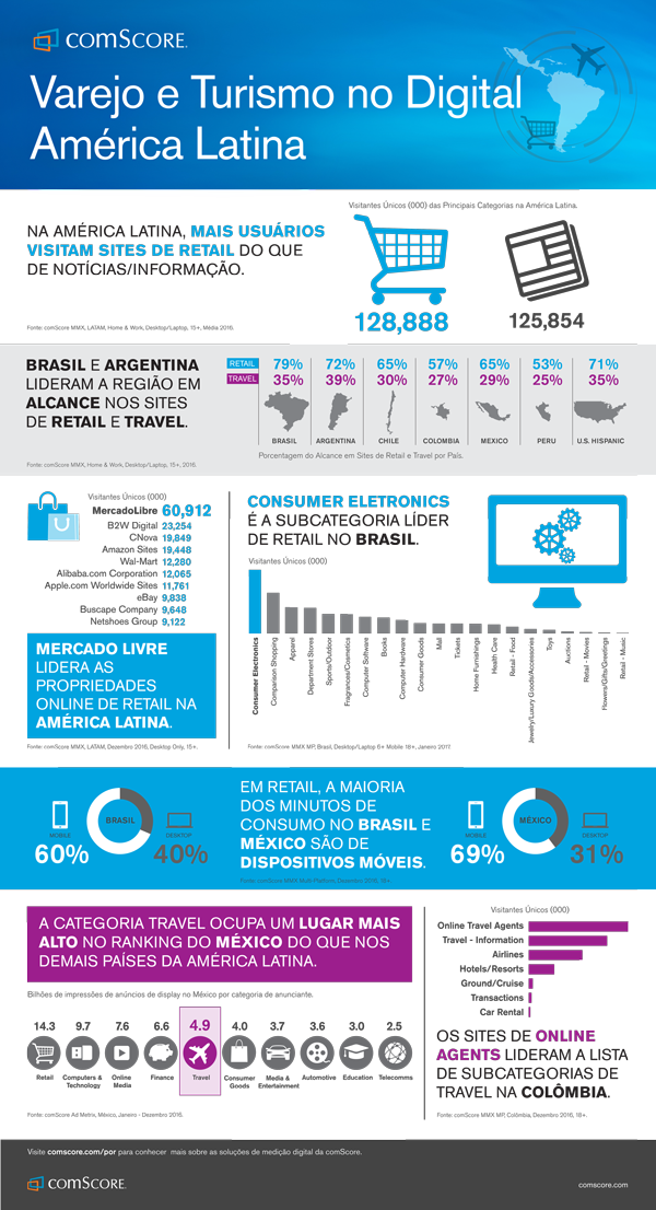 A Comscore divulgou os insights do ‘’O Poder do Digital para o Varejo e o Turismo’’, um estudo que analisa as principais tendências de consumo on-line dos internautas da América Latina. Clique aqui para baixar nosso mais recente infográfico que destaca o consumidor latino-americano, e como ele se relaciona com sites de retail e travel atualmente.