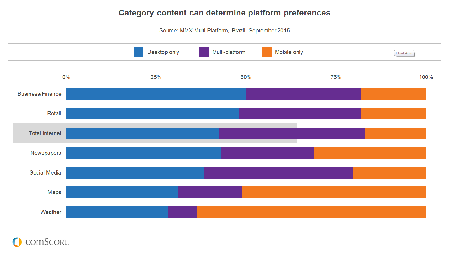 Em geral, vimos que 41 por cento do total da população digital no Brasil já acessa conteúdos digitais através de mais de uma plataforma – o que demonstra que os Brasileiros estão caminhando em direção à maioria multi-plataforma. Especificamente, o mobile teve um grande impacto na categoria de Mídias Sociais com 61 por cento dos usuários da categoria acessando através do mobile por mês, enquanto a categoria de Notícias sobre o Tempo mostra a maior participação de acessos feitos exclusivamente através do mobile.